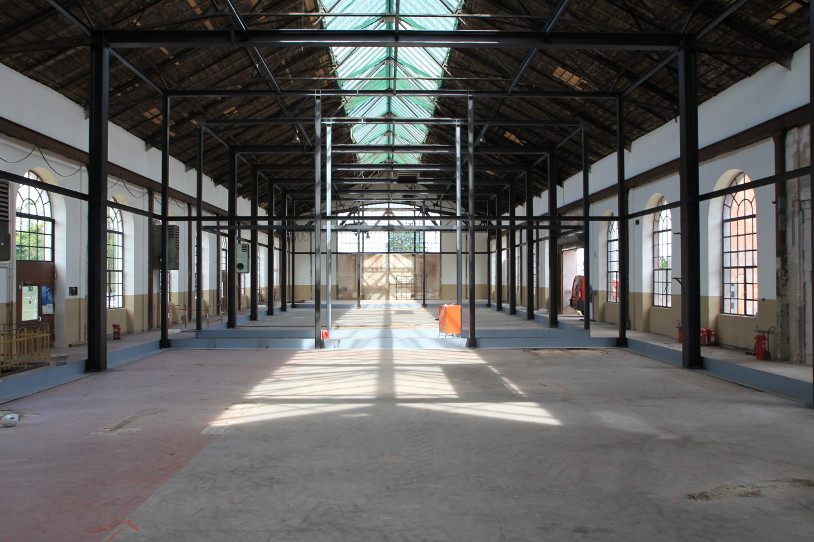 Die Maschinenhalle mit historischer Krananlage während des Umbaus. Foto: RAG-Archiv Saar