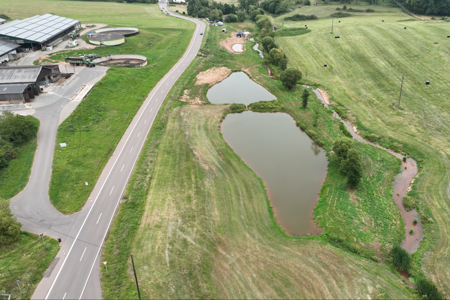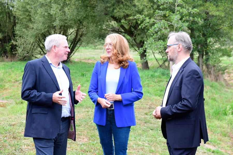 Nicole Büsing, Geschäftsführerin der Landschaftsagentur Plus, erläuterte: „Wir zeigen hier am Ellbach, was uns als Flächenagentur ausmacht. Wir liefern ein Komplettpaket, verbinden Planung, Fläche und Umsetzung – schnell, qualitätsgesichert und in enger Partnerschaft mit Kommunen und Unternehmen. Es ist unser Anspruch, Maßnahmen naturschutzrechtlich umzusetzen und auch als echten Beitrag zur Klimapolitik und zur regionalen Resilienz zu gestalten.“ Gemeinsam mit ihren Partnern modellierte die LA Plus den Bachverlauf neu: Heute windet sich der Ellbach wieder durch eine strukturreiche Auenlandschaft – mit Flutmulden, gewässerbegleitenden Biotopen und neu geschaffenen Lebensräumen. Die neuen Flutmulden nehmen bei Starkregen Wassermassen auf, und auch die Artenvielfalt hat deutlich zugenommen.