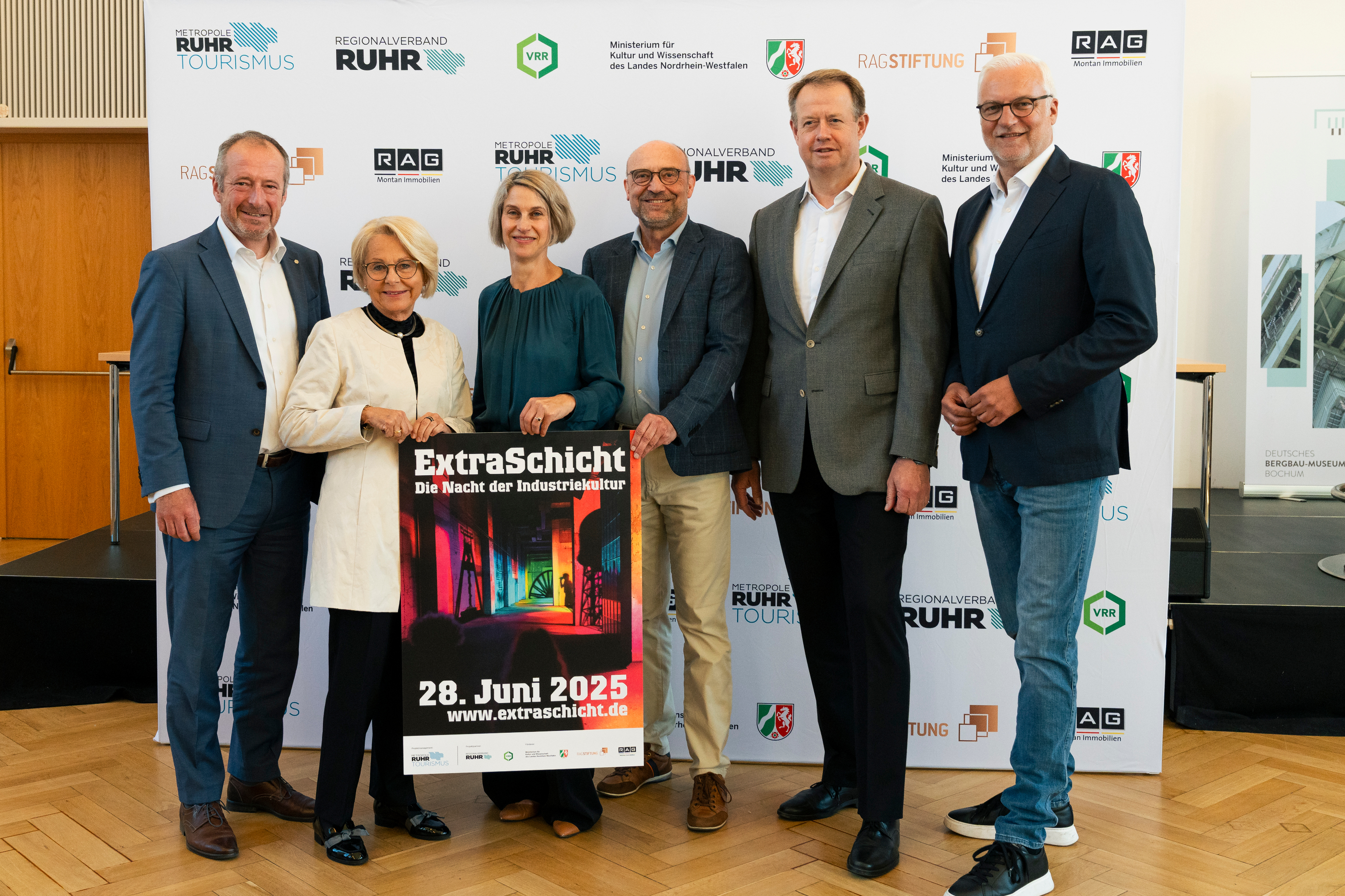 Das Foto zeigt die Teilnehmenden der heutigen Programmvorstellung der ExtraSchicht 2025: Oliver Wittke (Vorstandssprecher des Verkehrsverbunds Rhein-Ruhr), Bärbel Bergerhoff-Wodopia (Vorstandsmitglied der RAG-Stiftung), Prof. Dr. Sunhild Kleingärtner (Direktorin des Deutschen Bergbau-Museums Bochum), Axel Biermann (Vorsitzender der Geschäftsführung der Ruhr Tourismus GmbH), Michael Kalthoff (Vorsitzender der Geschäftsführung der RAG Montan Immobilien GmbH) und Garrelt Duin (Regionaldirektor des Regionalverbands Ruhr). Foto: Jannik Hanf