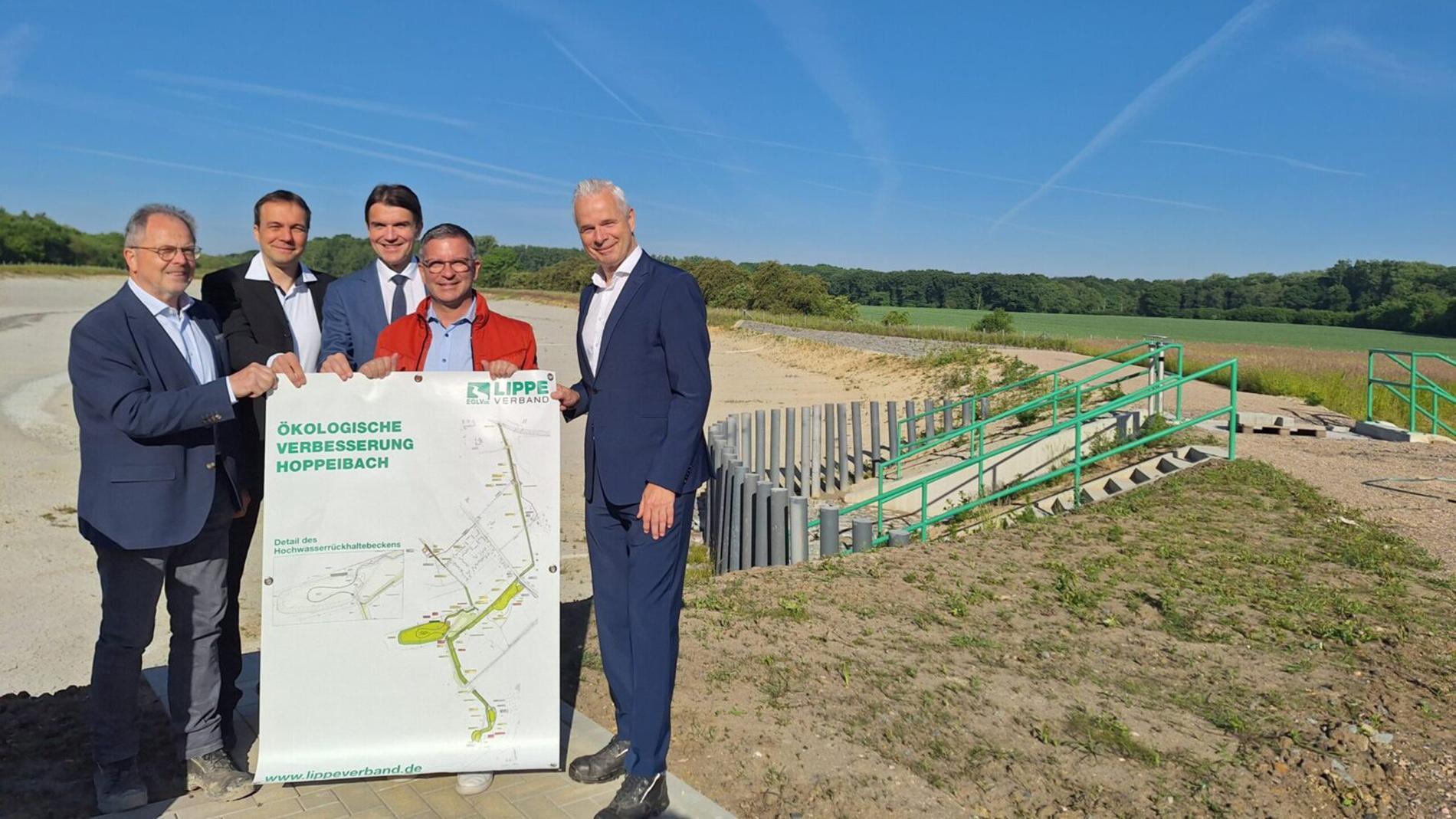In den Bau des Hochwasserrückhaltebeckens investierte der Lippeverband zirka zwei Millionen Euro. „Die Kosten für die Optimierung des Hochwasserschutzes am Hoppeibach wurden vollständig von uns, der RAG, übernommen, da es sich um bergbaubedingte Wiederherstellungsmaßnahmen handelt. Auf diese Weise leisten wir einen aktiven Beitrag zur ökologischen Umgestaltung der Region und übernehmen unsere gesellschaftliche Verantwortung für die ehemals als offene Schmutzwasserläufe genutzten Bäche“, sagt Marcel Tiedeken, Prokurist der RAG Aktiengesellschaft.