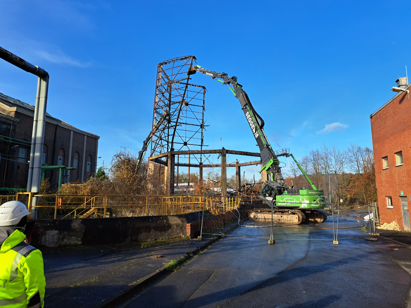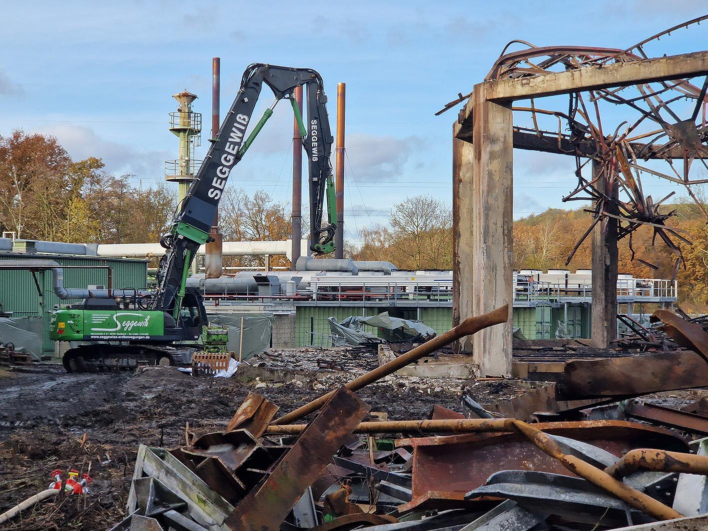 Schon im Vorfeld wurde das Gelände um das noch bestehende Stahlgerüst des Kühlturms in Richtung Nord und Nordwest gereinigt und von Asbest befreit. Dann rückten zwei Bagger mit langen Greifarmen an, so genannte Longfronts. Mit riesigen Zangen ausgerüstet gingen sie ans Werk. Der eine stützte das Stahlgerüst, der andere arbeitete sich im Laufe des Tages vom oberen Bereich bis zum Boden. Nur die Betonträger blieben noch stehen.