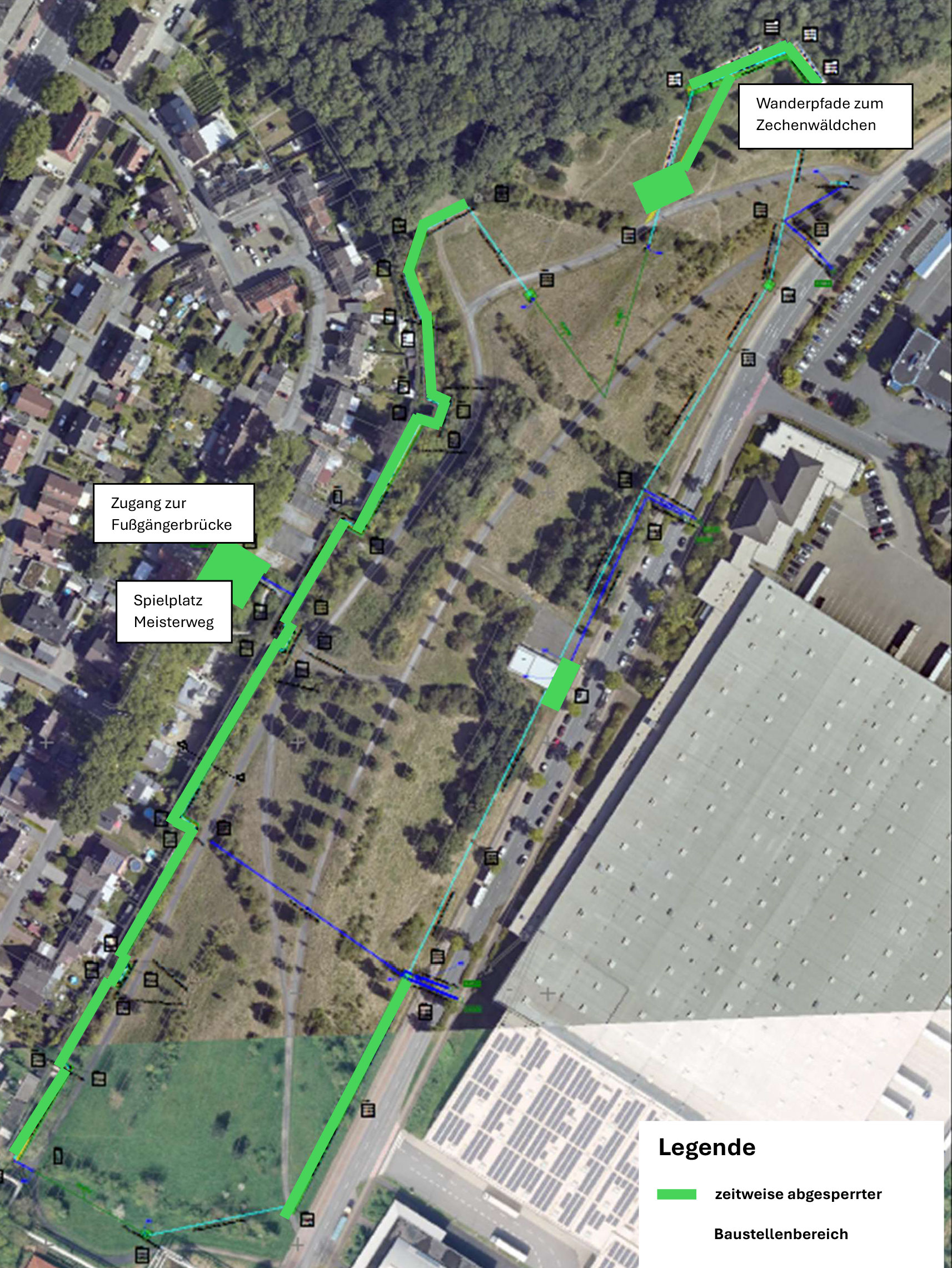 Außerdem wird während der Baumaßnahme der benachbarte Spielplatz kurzzeitig gesperrt, um Kinder und Erwachsene vor dem Baustellenverkehr zu schützen. Arbeiten werden auch in der Nähe der anliegenden Gärten am Meisterweg durchgeführt. Zeitweise ist zudem mit der Sperrung des Zugangs zur Fußgängerbrücke im Westen sowie der Wanderpfade im Norden ins Zechenwäldchen zu rechnen. Die Einschränkungen werden zeitlich so gering wie möglich gehalten.
