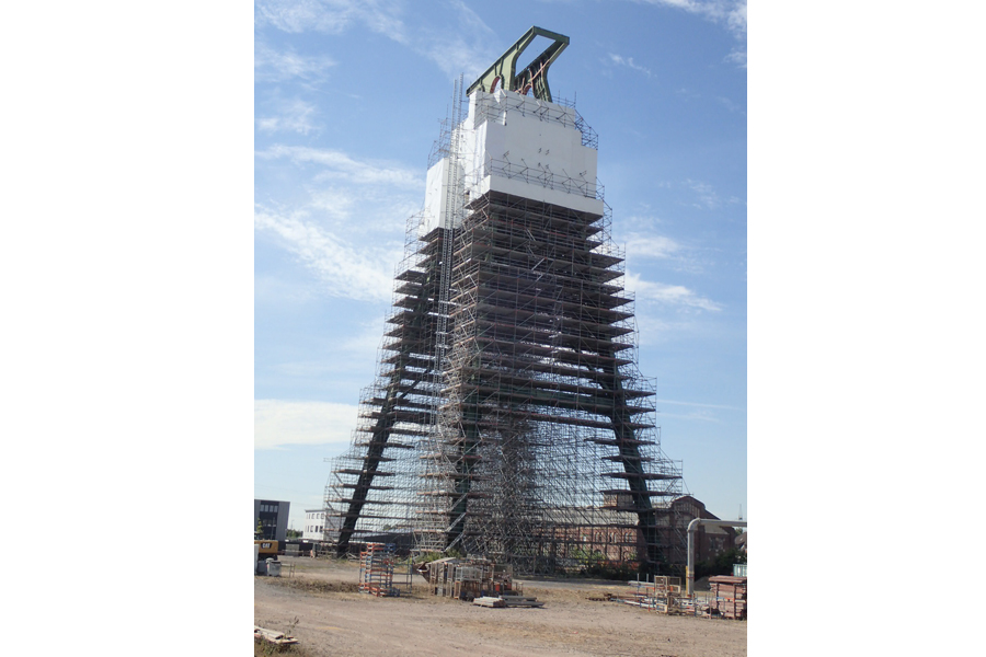 Zur Ertüchtigung des unter Denkmalschutz stehenden Doppelbocks sind aus statischen Gründen Verstärkungsmaßnahmen im Stahlskelett erforderlich. Um diese Arbeiten, und die im Anschluss daran zu erledigenden Korrosionsschutzanstriche in luftiger Höhe ausführen zu können, wurde das weithin sichtbare Baugerüst aufgebaut, das zum aktuellen Stand nahezu das gesamte, 74 m hohe Fördergerüst umhüllt. Die zugehörigen Seilscheiben wurden zuvor entfernt und werden nach deren Sanierung wieder an ihrer ursprünglichen Position eingebaut. Die Arbeiten werden bis ins nächste Jahr hinein andauern.