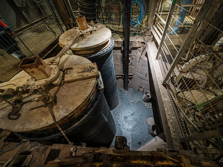 Ein paar Zahlen. Schacht 2 hat einen Durchmesser von 5,5 Meter, Schacht XII von 7,50 Meter. Sie reichen von der Tagesoberfläche rund 1050 Meter n die Tiefe. Zur Verfüllung wurden an den beiden Schächten über der 14. Sohle in rund 1000 Meter Tiefe Schalungsbühnen eingebracht. Diese bildeten die Grundlage für die anstehende Verfüllung. Zuvor wurde der unterste Teil des Schachtes, der sogenannte Schachtsumpf, mit Beton verfüllt. Er dient als Fundament für die Stahlkonstruktion der Schalungsbühnen. Die Höhe der Sohle selbst, rund fünf Meter, bleibt frei, um dort zukünftig gegebenenfalls das Grubenwasser anzunehmen.