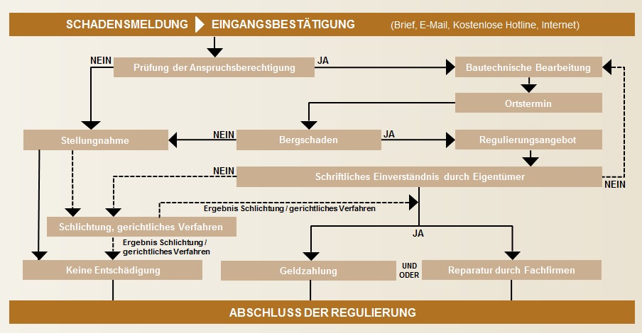 Über das Bergschaden-Service-Center mit kostenloser Hotline oder einer einfachen und formlosen Kontaktaufnahme per E-Mail gestaltet die RAG die Schadensmeldung für Betroffene so einfach wie möglich. Sachverständige Mitarbeiter des Unternehmens prüfen, ob die vorhandenen Schäden auf bergbauliche Einwirkungen zurückzuführen sind und stimmen dann zusammen mit den Bergbaubetroffenen die weitere Vorgehensweise ab.