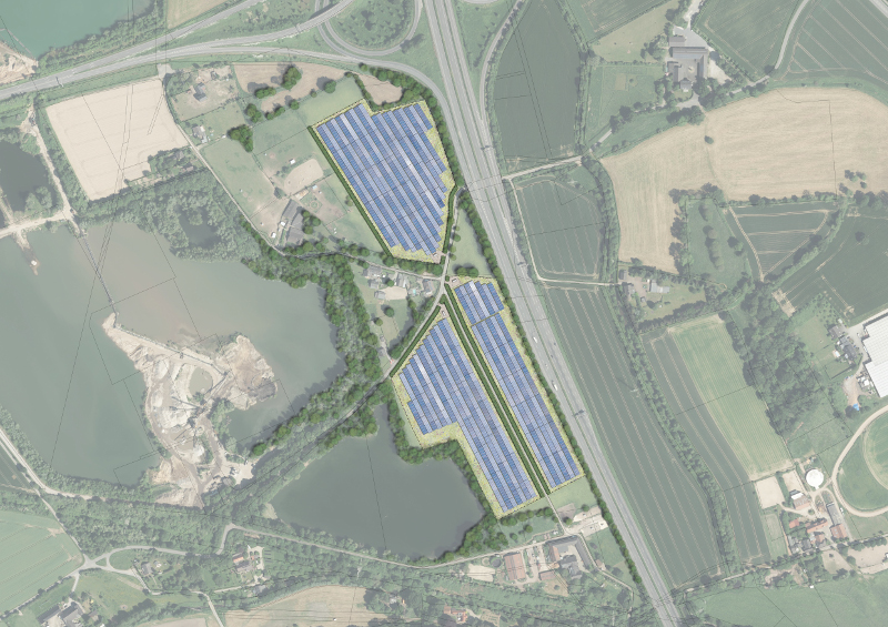 Das folgende Bild zeigt die geplanten Areale für die Photovoltaikanlage entlang der A57.