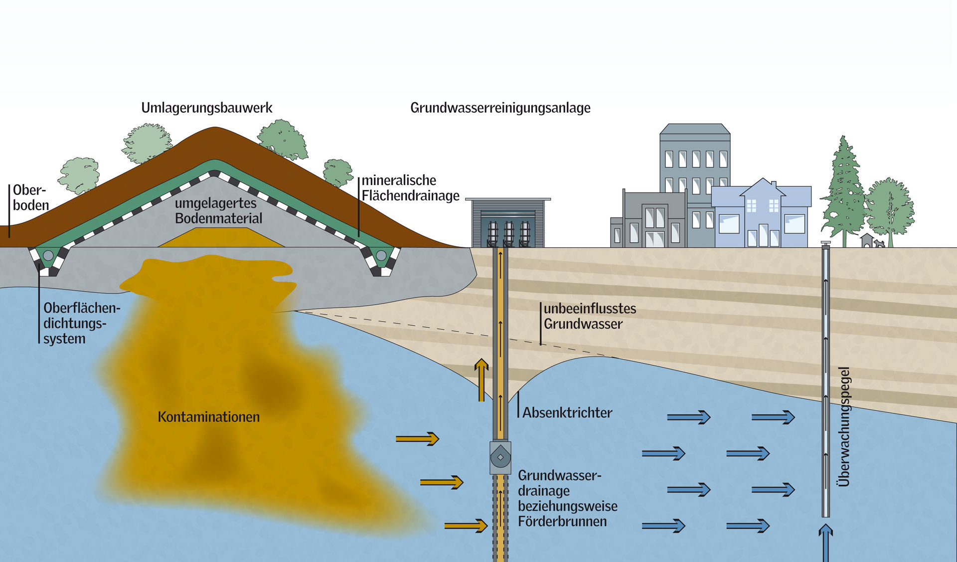 Das Umlagerungsbauwerk entsteht dort, wo sich der größte Teil der Kontaminationen im Untergrund befindet. Es schließt die Böden sicher ein. Das Grundwasser fangen Drainagen oder Brunnen ab. Pumpen fördern es in die Reinigungsanlage, wo Aktivkohle die Schadstoffe herausfiltert. Das gereinigte Grundwasser fließt in die Kanalisation oder in ein Gewässer. Überwachungspegel kontrollieren die Grundwasserqualität und die Sanierungsqualität großräumig in den angrenzenden Gebieten.